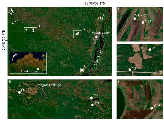 Figure 2. The studied fallow, arable and pyrogenic soils in the vicinity of Yakutsk. (A) Fallow soil (Y1); (B) Zonal soil (Y3); (C) Pyrogenic soil (Y5); (D) Pasture soil (Y6); (E) Meadow soil (Y7); (F) Zonal soil (Y9); (G) Arable soil (Y10); (H) Zonal soil (Y11); (I) Arable soil (Y12); (J) Arable soil (Y13).