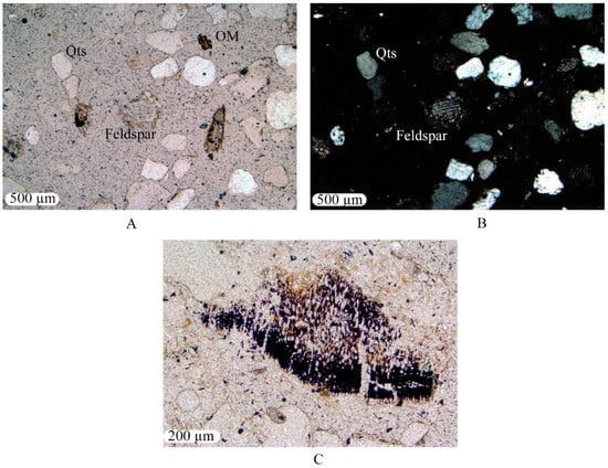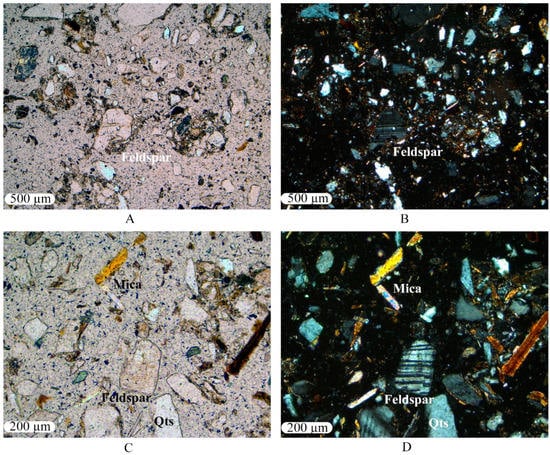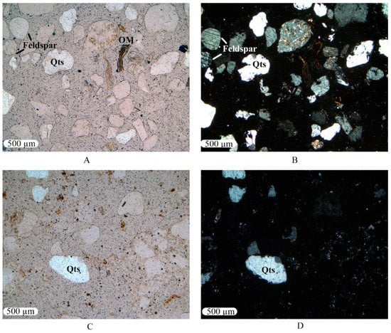 Figure 3. Micromorphological structure of the Y1 Ah (A,B) and Y3 Ah (C,D) soil profiles. (A,C)—plane polarized light; (B,D)—crossed polarized light. Qts-quartz; OM-organic matter.