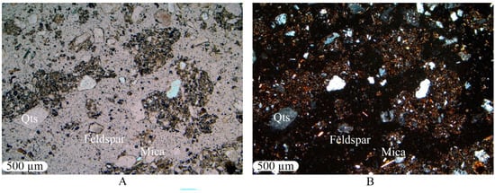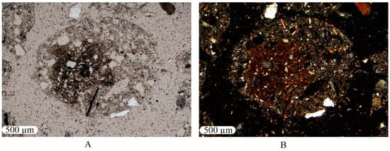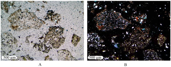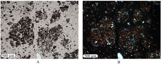 Figure 6. Micromorphological structure of the arable soil Y10 Ahp profile. (A) plane polarized light; (B) crossed polarized light.