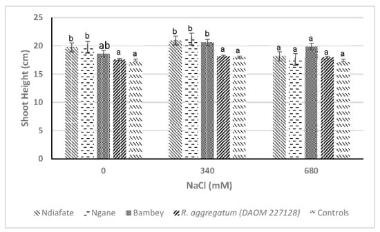 When grown under 0 and 340 mM NaCl, enhanced shoot growth was observed for the seedlings inoculated with isolates from Ndiafate, Ngane, and Bambey (high, moderate, and low salt zones, respectively) compared with the control without inoculation. Without the addition of NaCl, the height of the inoculated seedlings with Ndiafate high and Ngane moderate salt zones isolates (19.75 ± 3.27 cm) were significantly greater (p = 0.002) than those of the seedlings inoculated with single isolate R. aggregatum (DAOM 227128) and controls (17.55 ± 2.28 cm). At 350 mM of NaCl, AMF isolates from Ndiafate (20.95 ± 1.88 cm), Ngane (21.23 ± 3.20 cm), and Bambey (20.58 ± 2.54 cm) showed shoot height significantly higher (p = 0.04) compared with seedlings inoculated with R. aggregatum and non-inoculated controls. When the concentration of NaCl increased to 680 mM, no significant differences were observed (p = 0.164) between inoculated and non-inoculated plants (with an average shoot length of 18.22 ± 3.54 cm) (Figure 2).