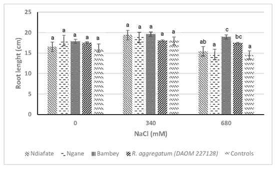 The effect of the AMF isolates × NaCl interaction on A. seyal root length after 30 days of culture. Ndiafate, Ngane, and Bambey correspond to high, moderate, and low salinity zones, respectively where the AMF were collected. Bars with the same letters for each variable are not significantly different at p < 0.05 (Newman–Keuls test) and error bars represent standard error of the mean (n = 270).