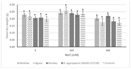 The effect of the AMF isolates × NaCl interaction on the dry biomass of the shoot parts of A. seyal seedlings after 30 days of culture. Ndiafate, Ngane, and Bambey correspond to high, moderate, and low salinity zones, respectively where the AMF were collected. Bars with the same letters for each variable are not significantly different at p < 0.05 (Newman–Keuls test) and error bars represent standard error of the mean (n = 270).