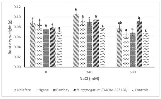 The effect of the AMF isolates × NaCl interaction on the dry root biomass of A. seyal seedlings after 30 days of culture. Ndiafate, Ngane, and Bambey correspond to high, moderate, and low salinity zones, respectively where the AMF were collected. Bars with the same letters for each variable are not significantly different at p < 0.05 (Newman–Keuls test) and error bars represent standard error of the mean (n = 270).