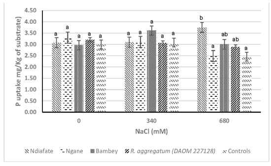 The effect of the AMF isolates × NaCl interaction on P uptake after 30 days of culture. Ndiafate, Ngane, and Bambey correspond to high, moderate, and low salinity zones, respectively where the AMF were collected. Bars with the same letters for each variable are not significantly different at p < 0.05 (Newman–Keuls test) and error bars represent standard error of the mean (n = 270).