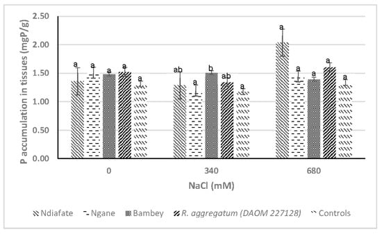 Effect of the AMF isolates × NaCl interaction on the accumulation of P in tissues after 30 days of culture. Ndiafate, Ngane, and Bambey correspond to high, moderate, and low salinity zones, respectively where the AMF were collected. Bars with the same letters for each variable are not significantly different at p < 0.05 (Newman–Keuls test) and error bars represent standard error of the mean (n = 270).
