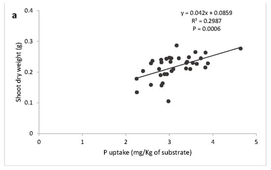 Correlation analyses were performed to evaluate whether P uptake and P accumulation in tissues influenced shoot dry weight and root dry weight of A. seyal (Delile) under saline conditions. The results in Figure 8 show a positive but weak relationship between P uptake (mg/Kg of substrate) and shoot dry weight (r = 0.30 ***; Figure 8a) and root dry weight (r = 0.19 ***; Figure 8b). There was also a significantly positive association between P accumulation in tissues (mgP/g) and shoot dry weight (g), root dry weight (g) (Figure 8). The results revealed a low effect size but positive correlation between P accumulation in tissues and shoot dry weight (r = 0.41 ***; Figure 8c) and root dry weight (r = 0.25 ***; Figure 8d).