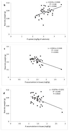 Correlation analyses for P uptake (a,b) and P accumulation (c,d) in tissues shoot dry and root dry weight of A. seyal (Delile) under saline conditions.