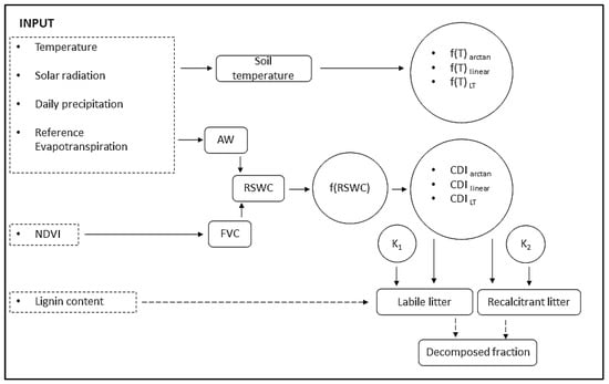 Here, litter decomposition was characterized by different decomposition rates of its two main constituents: lignin (recalcitrant litter) and cellulose, hemicellulose, and soluble components (labile litter). Decomposition rates varied over time and as a function of climatic conditions (CDI effects). On this theoretical basis, the model was built and organized into various sub-modules that could be interconnected to explore multiple processes that interact mutually at the same time. Among the innovations was the influence of vegetation on the calculation of the Relative Soil Water Content (RSWC) as a function of the vegetation density of the area, expressed as Fractional Vegetation Cover (FVC) and calculated based on the Normalized Difference Vegetation Index (NDVI).