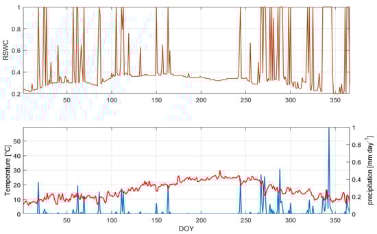 Daily trends of relative soil water content (RSWC, brown line), temperature (°C, red line), and precipitation (mm, blue line) during 2020. RSWC is a dimensionless value, where this variable assumes a 0 value under the water stress condition (RSWC = 0) or 1 in absence of the water stress condition (RSWC = 1).