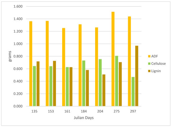 Dynamic of ADF, cellulose, and lignin components expressed as sample-based weights of the remaining biomass for each Julian Day.