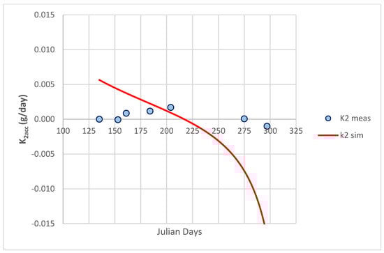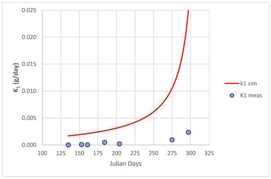 Simulated k1 values (g/day) obtained by Equation (9) (continuous line in red) and the observed ones obtained by Equation (8) (points in blue).