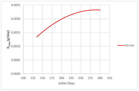 Values of k2deg (t) interpolated by the Equation (11). The curve k2deg (t) was taken from Vitale et al. (Adapted with permission from Vitale et al. [40]. Copyright 2014, copyright iForest – Biogeoscience and Forestry) -after conversion in (g/day), since the initial rate of lignin degradation was not recorded for this study.