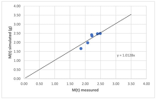 M(t)simulated vs. M(t)measured data over time. It was evident a light overestimation of the model (M(t)modelled/M(t)measured = 1.0128).