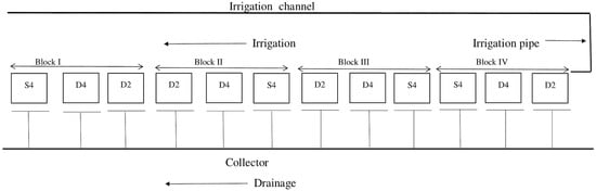 The field experiment comprised four blocks of three treatments (plots) arranged in a randomized complete block design (Figure 1). The area of individual plots was 8 m × 8 m, and a 4 m wide zone separated adjacent plots and blocks. The treatments were: shallow drainage to 0.6 m depth, with drain weir open four times per week (S4) and deep drainage to 1.2 m depth with drain weir open four times per week (D4) or two times per week (D2). The shallow drainage depth corresponds to the traditional drainage system in the area, while the deep drainage treatments correspond to conventional (D4) and controlled drainage (D2). During the experiment, the drain weirs were opened for one hour for outflow measurements and then kept closed until the next scheduled opening time.