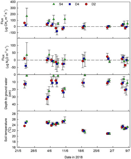 Flux of methane (CH4) and nitrous oxide (N2O), groundwater level, and soil temperature in the period May-July 2018 in treatments with: shallow drainage to 0.6 m with weir open four times per week (S4) and deep drainage to 1.2 m, with weir open four times per week (D4) or two times per week (D2). Error bars denote one standard error (n ≤ 4). The flux values represent fluxes from soil-surface including vegetation, negative values indicating uptake of CH4 or N2O.