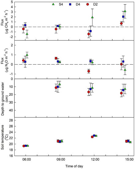 Diurnal pattern in methane (CH4) and nitrous oxide (N2O) fluxes, groundwater level, and soil temperature in treatments with: shallow drainage to 0.6 m with weir open four times per week (S4) and deep drainage to 1.2 m with weir open four times per week (D4) or two times per week (D2). Error bars denote one standard error (n ≤ 4). The flux values represent fluxes from the soil-surface including vegetation, with negative values indicating uptake of CH4 or N2O.