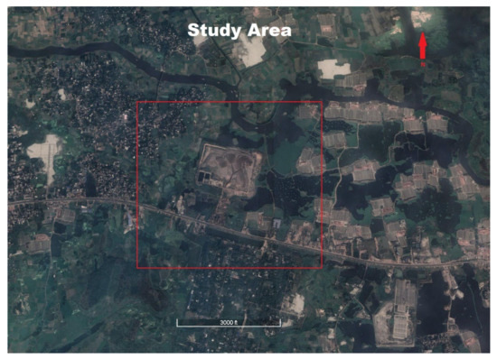 Our study area, the sanitary landfill at Amin Bazar, is located at Savar Upazilla in Dhaka, Bangladesh, near the low-lying floodplain of the Karnatali River. The landfill lies between the latitude 23°48′0.86″ and 23°47′44.33″ N, and longitude 90°17′51.03″ and 90°18′12.03″ E. Since 2007, the location has been used as a dumpsite, with the first phase of its operation being an open dumpsite (Figure 1). Currently, this facility is a semi-aerobic sanitary landfill site with a total size of roughly 20.23 hectares that operates with the fast breakdown of wastes. Between June and October of the year, the region is submerged during every rainstorm [16].
