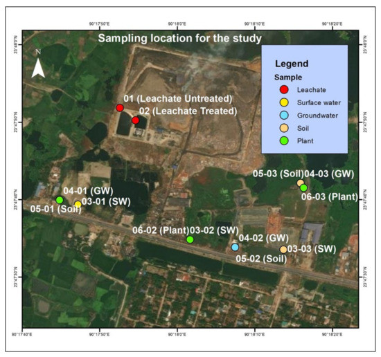 Altering the natural quality of soil, surface water, and groundwater has a major impact on the environment as well as on human health [9,13,14]. Therefore, leachate pollution is an alarming concern for the environment and has become one of the major concerns for the current age. Leachate is an unavoidable substance of a landfill, but its impact on the environment can be avoided. The assessment of possible risks from the landfill leachate is crucial for sustainable environmental management [15]. The study on all four components of the environment (surface water, groundwater, soil, and plants) is essential to understand the impact of landfill leachate on the environment. Thus, this study aims to investigate the environmental impact occurring from the landfill leachate by analyzing some physical and chemical parameters such as electrical conductivity (EC), total dissolved solids (TDS), dissolved oxygen (DO), pH, turbidity, salinity, temperature, total hardness, lead (Pb), nickel (Ni), chromium (Cr), cadmium (Cd), cobalt (Co), and arsenic (As) in leachate, surface water (SW), groundwater (GW), surrounding soil, and plants. To determine the contribution of landfill leachate in heavy metal(loid)s concentration in soil, water, and plants, Inverse Distance Weighted (IDW) analysis in GIS was performed.