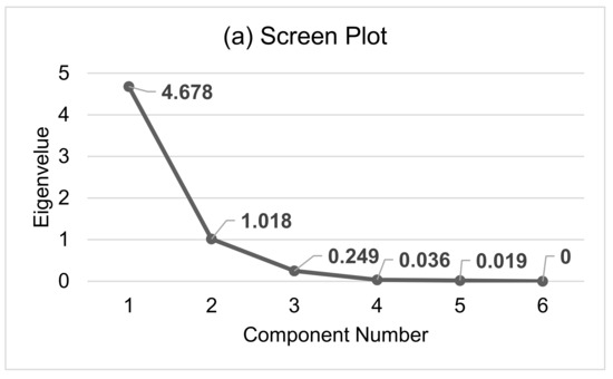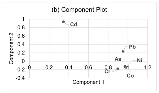 Principal component analysis of the analyzed heavy metal concentration by (a) scree plot and (b) component plot.