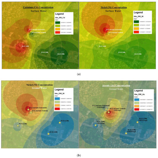IDW of (a) Cd and Ni concentration in surface water and (b) Ni and As concentration in groundwater.