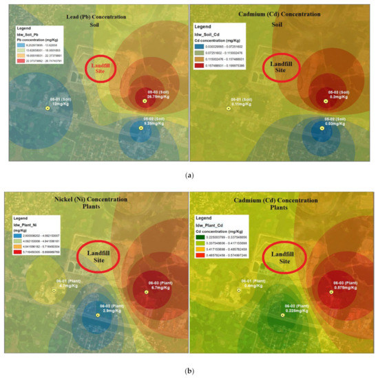 The same goes for the Pb and Cd in the soil and plant samples (Figure 6). The concentration of Pb, Cd, and Ni shows the most acceptable result based on IDW. Sample 06-01 and sample 06-03 were closer to the landfill site and sample 06-02 was farther. Therefore, the concentration of all these heavy metal(loid)s was higher in samples 06-01 and 06-03. More GIS analysis of soil and plant has been added in Supplementary Figure S1.
