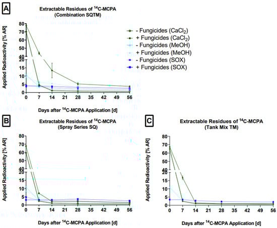 The extractable residues (% AR) of MCPA in the 0.01 M CaCl2, MeOH, and Soxhlet (SOX) extracts on days 0, 7, 14, 28, and 56 are presented. (A) SQTM−F: control, SQTM+F: combination (B) SQ-F: control, SQ+F: spray series and (C) TM-F: control, TM+F: tank mix. The mean values and standard deviations were derived from triplicates (n = 3).