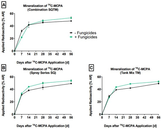 The mineralization (% AR) of MCPA in the absence (-F, black line) and presence (+F, green line) of the fungicides on days 0, 7, 14, 28, and 56 are presented. (A) SQTM-F: control, SQTM+F: combination (B) SQ-F: control, SQ+F: spray series, and (C) TM-F: control, TM+F: tank mix. The mean values and standard deviations were derived from triplicates (n = 3).