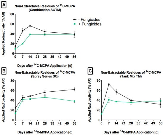 The non-extractable residues (% AR) of MCPA in the absence (-F, black line) and presence (+F, green line) of the fungicides on days 0, 7, 14, 28, and 56 are presented. (A) SQTM-F: control, SQTM +F: combination (B) SQ-F: control, SQ+F: spray series, and (C) TM-F: control, TM+F: tank mix. The mean values and standard deviations were derived from triplicates (n = 3).