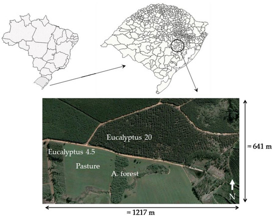 Map of Brazil, with Rio Grande do Sul State shown as hatched; map of Rio Grande do Sul State with Butiá shown as hatched; and image from Google Earth with the land uses studied. Image of Google Earth dated 5 September 2005.