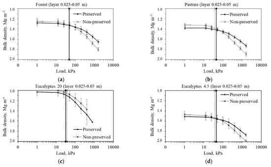 Soil compression curve for soil with preserved and non-preserved structure in the 0.025–0.05 m soil layer for four land uses. Vertical error bars for each pressure indicate the least significance difference, while vertical bars that accompany the superior and inferior axes in the figure indicate the precompression stress value for the preserved and non-preserved soil structures.