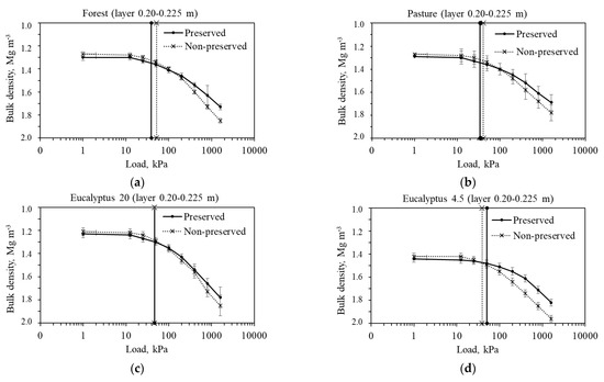 Soil compression curve for soil with preserved and non-preserved structure in the 0.20–0.225 m soil layer for four land uses. Vertical error bars for each pressure indicate the least significance difference, while vertical bars that accompany the superior and inferior axes in the figure indicate the precompression stress value for the preserved and non-preserved soil structures.