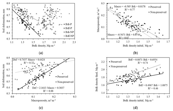 Although the initial bulk density was equal for soil with preserved and non-preserved structure, the latter soil reached the highest values at the end of the compression test and, consequently, the largest soil deformation (Table 3, Figure 2, Figure 3, Figure 4 and Figure 5). As the initial bulk density increased, there was a decrease in soil deformation, and this decrease was more pronounced in soil with preserved structure (Figure 6a). Macropores decreased as bulk density increased (R2 = 0.77 and 0.87, respectively, for preserved and non-preserved soil structure) (Figure 6b); therefore, the soil became less compressive, i.e., lower deformation occurred (R2 = 0.88 and 0.32, respectively, for preserved and non-preserved soil structure) (Figure 6c). With an increase in the initial bulk density, there was an increase in the range of the final bulk density between soil with preserved and non-preserved structure (R2 = 0.46 and 0.74, respectively, for preserved and non-preserved soil structure) (Figure 6d).