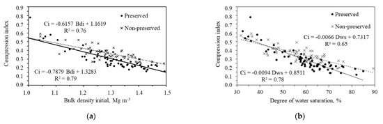 Soil with non-preserved structure presented the highest values of compressibility index, while the increase in bulk density and degree of water saturation decreased the compressibility index. Other authors [17,59,77] also observed that the increase in bulk density decreased the compressibility index, while Reichert et al. showed that by increasing moisture, the compressibility index increased as well [77].