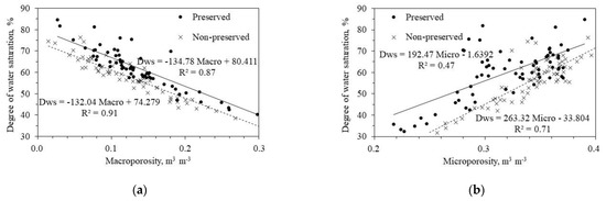 The degree of water saturation was affected by soil structure type (preserved and non-preserved) (p < 0.05) only in forest (Table 4). By decreasing macroporosity (R2 = 0.87 and 0.91, respectively, for preserved and non-preserved soil structure) (Figure 8a) and increasing microporosity (R2 = 0.47 and 0.71, respectively, for preserved and non-preserved soil structure) (Figure 8b), there was an increase in the degree of water saturation. Air permeability did not differ statistically (p > 0.05) between soil structure types (Table 4).