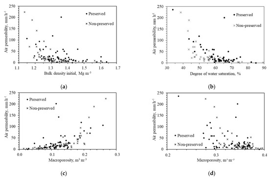 Increase in air permeability was associated with an exponential decrease in bulk density (Figure 9a), degree of water saturation (Figure 9b), microporosity (Figure 9d), and an increase in macropores (Figure 9c). This behavior shows that the air flow occurred mainly in the macropores. By increasing macroporosity (Figure 9c) and reducing the degree of water saturation (Figure 9b), more pores were available for air flow.