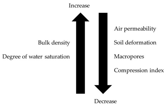 We observed that soil structure (preserved and non-preserved) had significant influence, especially on microporosity, compressibility index, soil deformation, and bulk density at the end of the compression test. Increasing bulk density and degree of water saturation decreased air permeability, soil deformation, macropores and compression index (Figure 10).
