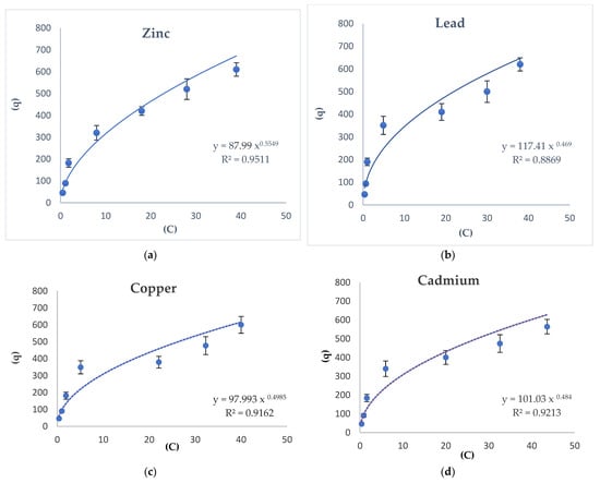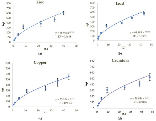 The Freundlich isotherm adsorption of Zn, Pb, Cu, and Cd (a–d) in the acidic soil sample.