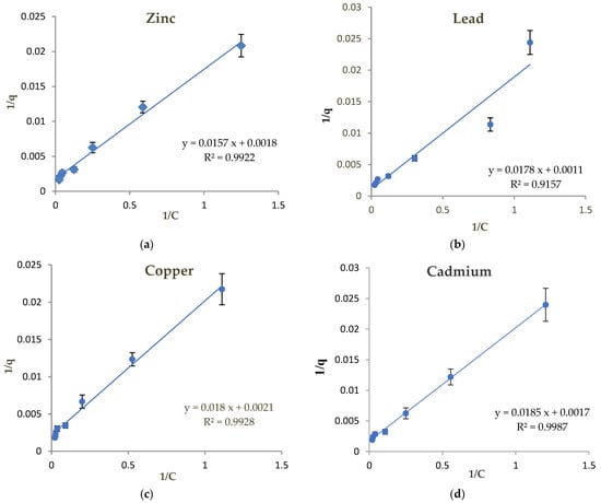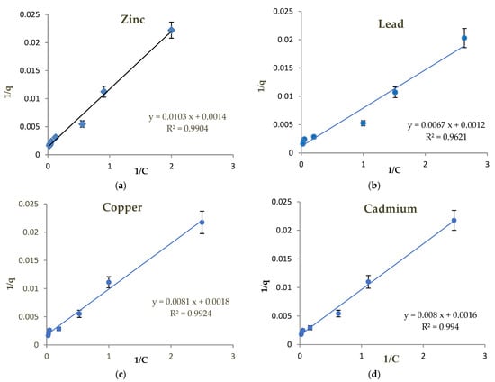 The Langmuir isotherm adsorption of Zn, Pb, Cu, and Cd (a–d) in the acidic soil sample.