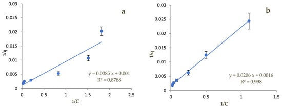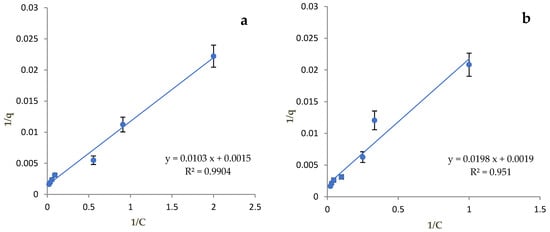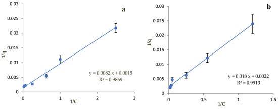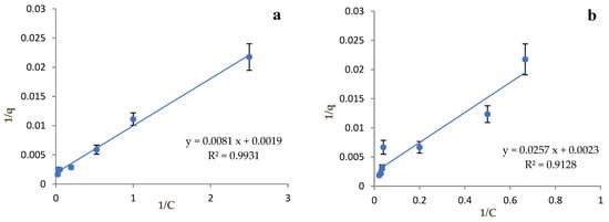 Due to the complexity of the above equation, it is necessary to “linearize” it, that is, to simplify it in such a way that the final relation has the form y = ax + b. Thus, the Langmuir adsorption isotherm expression becomes 1/q = [1/(qmax KL)] × (1/C) + 1/qmax. Therefore, a = 1/(qmax KL), b = 1/qmax and KL= b/a.