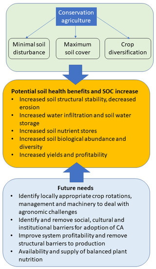 Principles of conservation agriculture, benefits of increasing SOC, and future needs. Modified from [7].