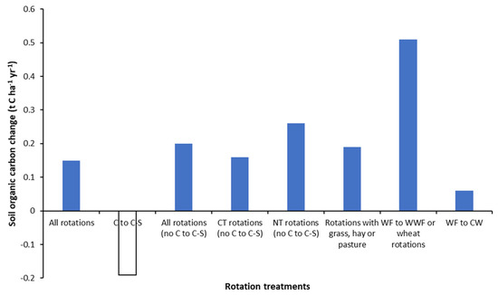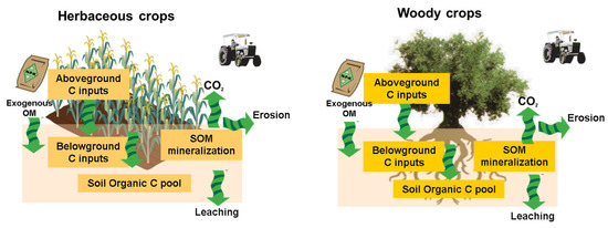 The highest values were achieved for woody crops under warm temperate conditions at around 1.0 t C ha−1 yr−1, whereas this figure was between 0.3 and 0.6 t C ha−1 yr−1 for arable crops. This was mainly due to the lower soil disturbance when the plant cover is grown in the inter-row area of woody crops than in the case of arable crops. Average SOC sequestration rates are typically higher in low-duration experiments, when SOC levels are closer to the equilibrium, than in longer ones [69].