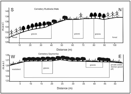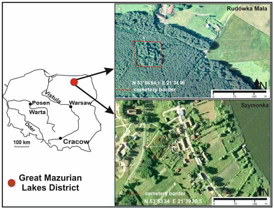 The landscape of the District of the Great Masurian Lakes is characteristic of areas shaped during the last glaciation. The terrain is undulating and hilly, with numerous lakes lying in depressions in the land. The flat terrain was used for agriculture, while the hilly terrain was and is often used for, among other things, the establishment of cemeteries. A similar situation occurred in the case of the cemeteries analysed (Figure 2).