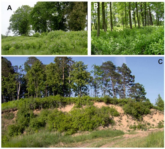 Occurrence of Syringa vulgaris: (A)—dense thickets in the edge of the Szymonka cemetery; (B)—mass development in the undergrowth; and (C)—colonization of the devastated fragment of the Rudówka Mała cemetery.