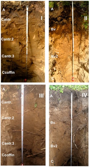 Soil profiles: (I)—Burial Necrosol Rudówka Mała; (II)—Unburial cemetery soil Brunic Arenosol Rudówka Mała; (III)—Burial Necrosol Szymonka; and (IV)—Unburial cemetery soil Szymonka.