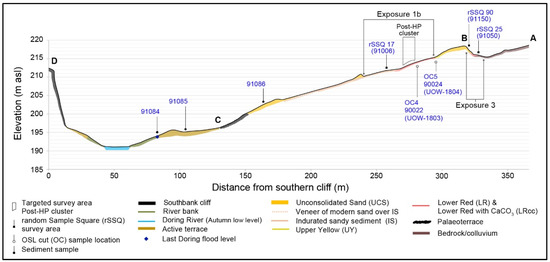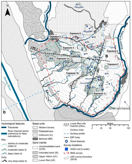 - Ames, C.J.H.; Chambers, S.; Shaw, M.; Phillips, N.; Jones, B.G.; Mackay, A. Evaluating erosional impacts on open-air archaeological sites along the Doring River, South Africa: Methods and implications for research prioritization. Archaeol. Anthropol. Sci. 2020, 12, 103. [Google Scholar] [CrossRef]