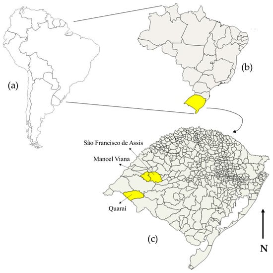Map without scale from South America (a) Brazil and Rio Grande do Sul State highlighted (yellow) (b) and the cities of Quaraí (latitude 30°23′17″ S; longitude 56°29′56″ W; 112 m mean altitude; area ≅ 3238 km2), Manoel Viana (latitude 29°35′07″ S; longitude 55°29′13″ W; 113 m mean altitude; area ≅ 1391 km2), and São Francisco de Assis (latitude 29°33′01” S; longitude 55°07′52″ W; 125 m mean altitude; area ≅ 2507 km2), Rio Grande do Sul State (c).