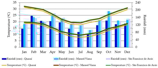 Mean monthly rainfall and temperature for the period 1981–2010. Climatological mean based on 30 years of data (1981–2010), using official INMET stations, and later interpolating for locations that do not have a meteorological data measurement station. Source: [].