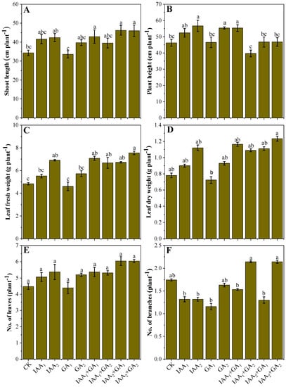Influence of individual and/or combined foliar application of natural phytohormones on growth and biomass characteristics, e.g., shoot length (A), total plant height (B), leaf fresh weight (C), leaf dry weight (D), no. of leaves (E), and no. of branches (F) of mung bean plants grown in sandy-loam soil in sub-tropics. The bar values are an average of three replicates (n = 3), and the bars not sharing the same lowercase letters indicate significant differences from each other according to Bonferroni’s statistical analysis at p < 0.05.