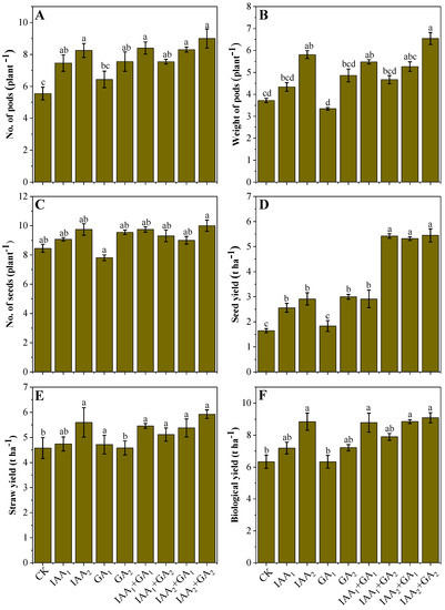 Influence of individual and/or combined foliar application of natural phytohormones on yield-related characteristics, e.g., no. of pods (A), weight of pods (B), no. of seeds per plant (C), seed yield (D), straw yield (E), and biological yield (F) of mung bean plants grown in a sandy-loam soil in sub-tropics. The bar values are an average of three replicates (n = 3), and the bars not sharing the same lowercase letters indicate significant differences from each other according to Bonferroni’s statistical analysis at p < 0.05 level.