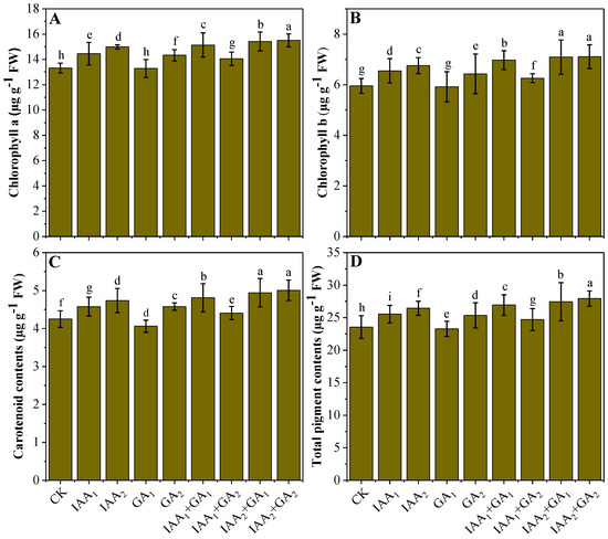 Influence of individual and/or combined foliar application of natural phytohormones on the physiological parameters, e.g., chlorophyll a (A), chlorophyll b (B), carotenoid contents (C), and total pigment contents (D) of mung bean plants grown in a sandy-loam soil of sub-tropics. The bar values are an average of three replicates (n = 3), and the bars not sharing the same lowercase letters indicate significant differences from each other according to Bonferroni’s statistical analysis at p < 0.05 level.